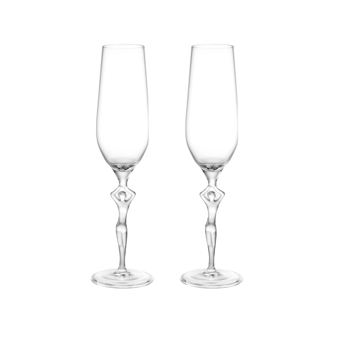 Their stems feature a slender woman reaching upwards, with the fluteβs bowl resting in her fingers as she offers it.