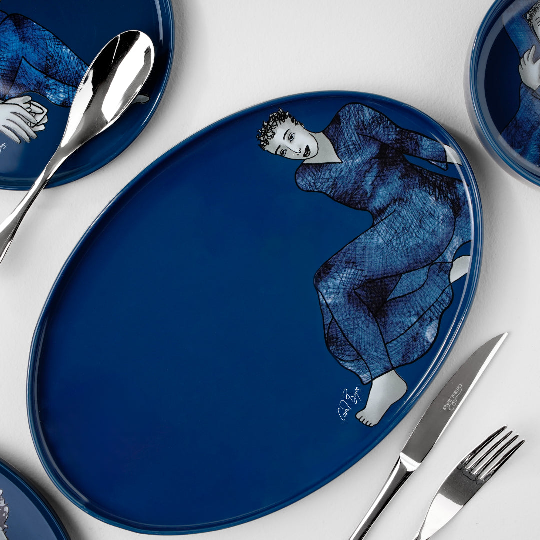 This beautiful deep blue jewel-toned platter features a woman, figuratively sketched, in a languorous pose.