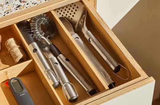 - Utensil heads retract for compact storage.