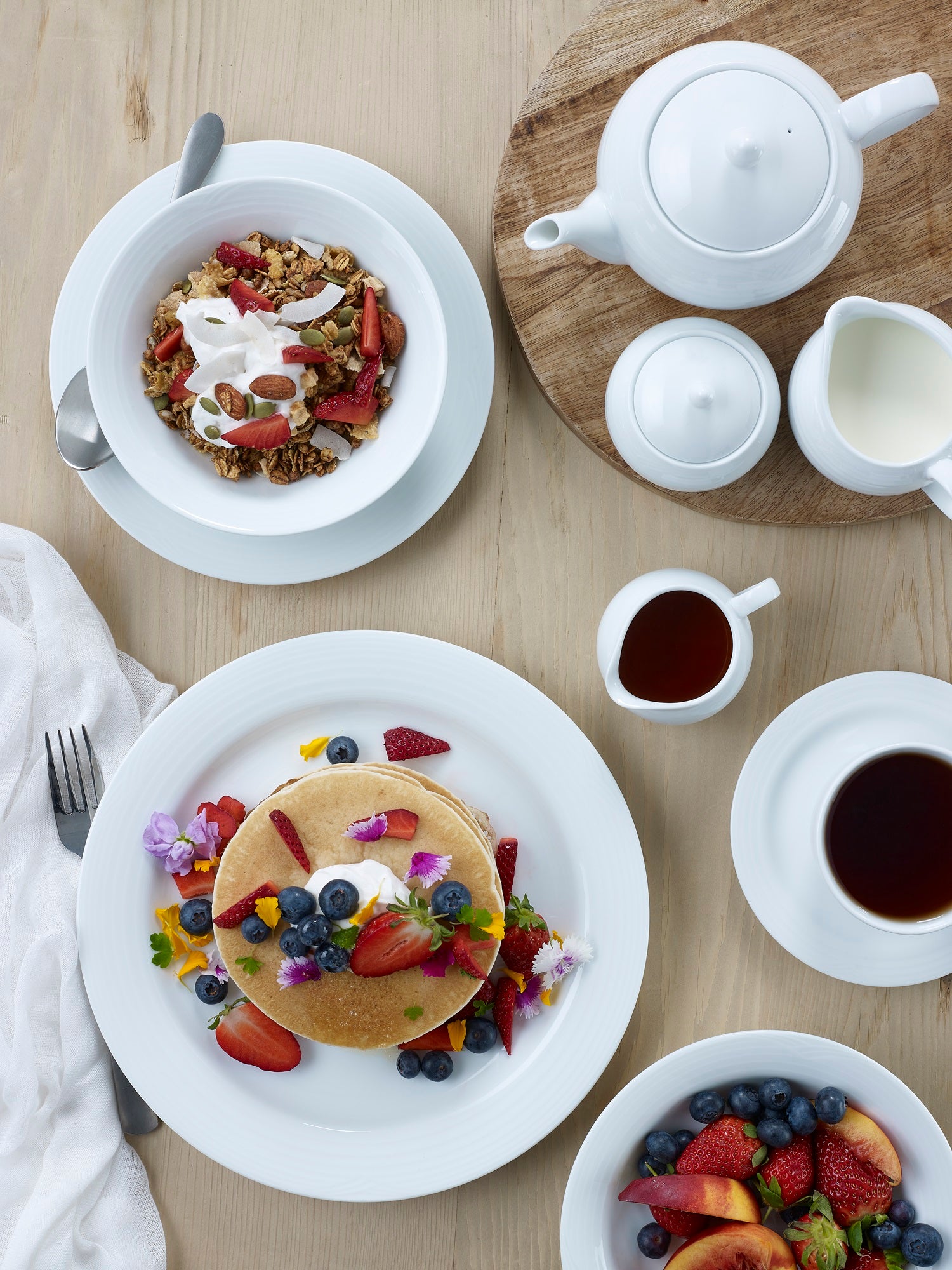 Contemporary design in white with a subtle circular embossed rim on a fine white porcelain body. Arctic White is a stylish pattern that is versatile enough be used as a casual breakfast setting or can just as easily be 'dressed up' for formal dining.