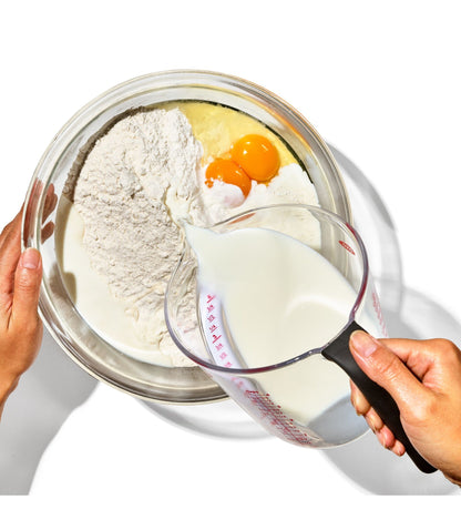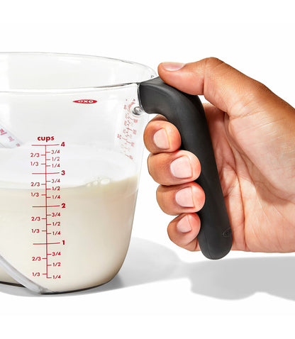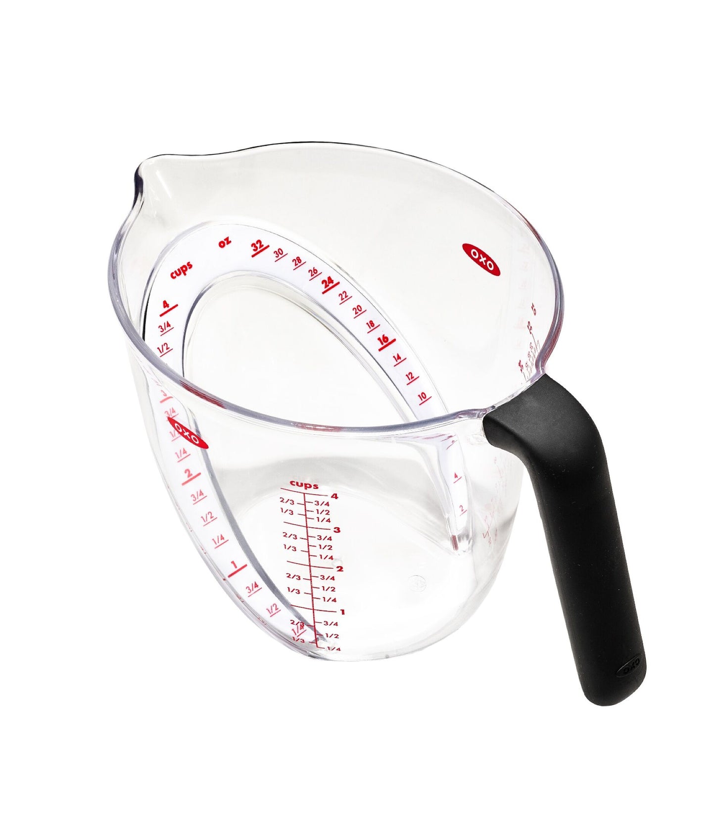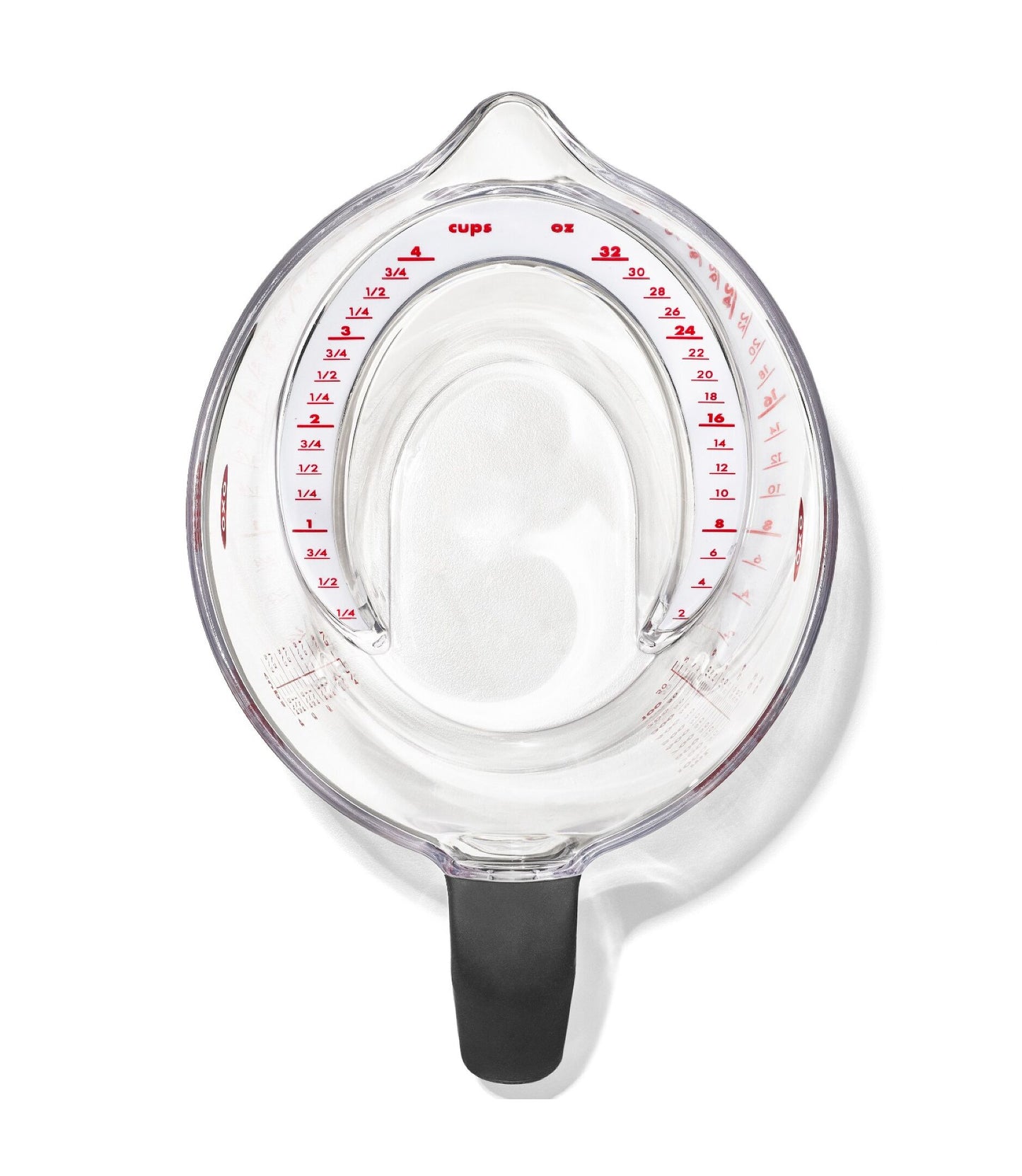 The patented angled surface allows you to see measurement markings from above as you're pouring, so you can better measure ingredients without bending or lifting the cup to eye level. Contains markings for cups, ounces, and milliliters. Also available in 1-Cup and 2-Cup versions. Top-rack dishwasher safe. BPA Free. Microwave Safe.