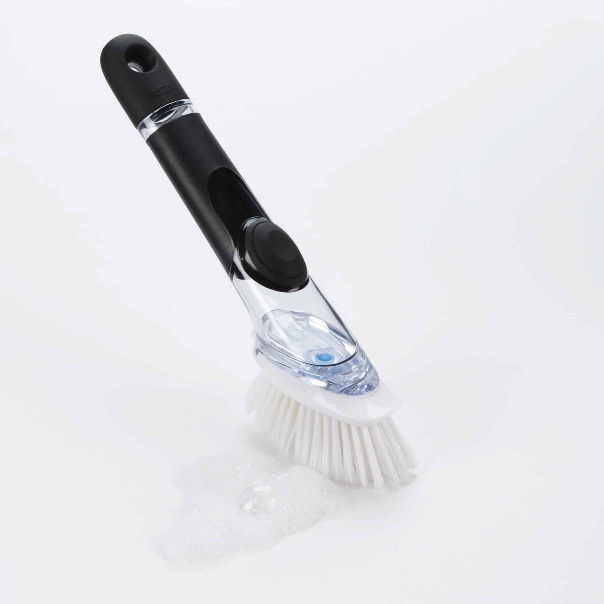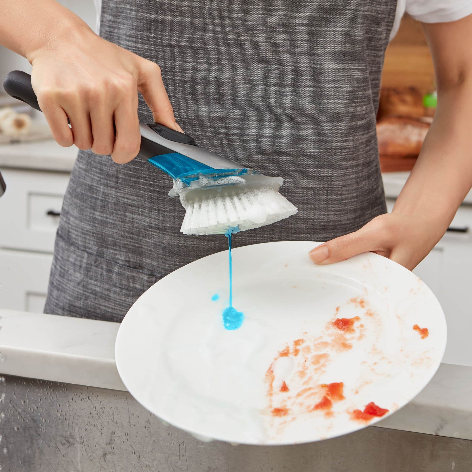 With a light push of the soft, non-slip button, the silicone valve shoots soap onto your dishes, then quickly seals to prevent drips and waste. Includes a scraper on back to remove baked-on food. Durable nylon bristles are safe for non-stick cookware and bakeware. Nylon