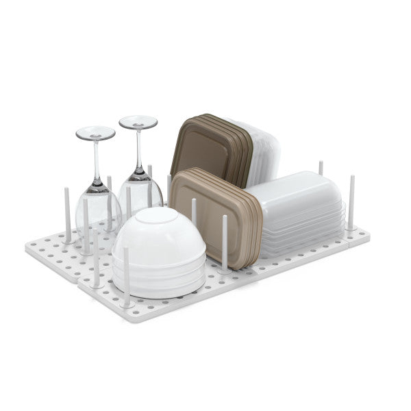 What makes Peggy unique is the adjustable tray and removable pegs that can be repositioned at any time. You choose where to place them based on your needs which means you can create the perfect fit to accommodate your plastic food storage containers and lids, your cookware including pots, pans and lids, your mixing bowls, your cooking utensils and just about anything else you want to keep organized and in its place.