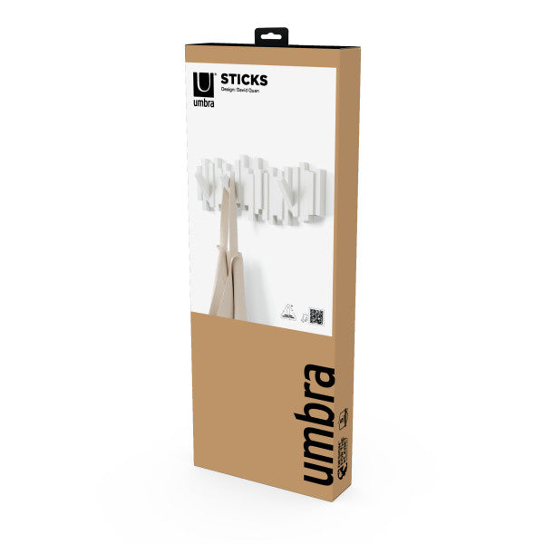 Umbra's Sticks Multi Hook is a sculptural and yet functional wall coat rack that will provide you with ample hanging space in virtually every area of your home, office or dorm room. It is versatile, decorative and accommodates all your personal hanging needs for coats, scarves, purses, umbrellas, bathrobes, towels, accessories or even light weighted cleaning tools like brooms. The deceptive design of Sticks looks at first glance like a modern piece of art until it boasts its clever design with 5 flip-down hooks which can be flipped up when not in use, creating a clean, seamless profile thatβs great for tight spaces or minimalist decor styles. Each flip-hook holds 2kg load per hook making it a strong helper to keep your home better organized. Sticks comes with mounting hardware making installing it super easy and fast. The hidden mounting hardware gives this contemporary coat rack a seamless, floating look.
