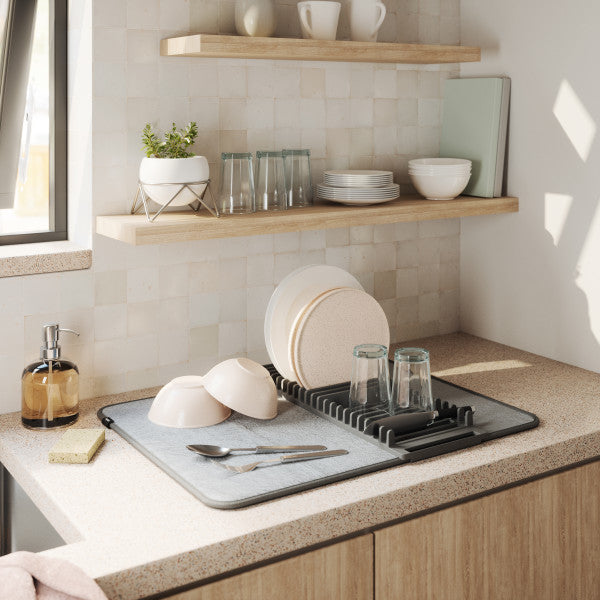Umbra's Udry is an innovative solution to dry dishes quickly and easily. Its versatile design combines a dish rack, utensil caddy, stemware holder and machine washable drying mat. This easy-to-use dish rack holds 18 plates, making it easy and quick to dry your dishes. Constructed of durable polypropylene, the lightweight, microfiber mat absorbs water from drying dishes, while also protecting countertops from scratching and water buildup. UDry is optimal when in use, and when not idle, compactly folds up to store in cupboards and leave your counter clutter-free. The space-saving drying solution provides storage and organization, while simultaneously acting as a functional drying mechanism.
