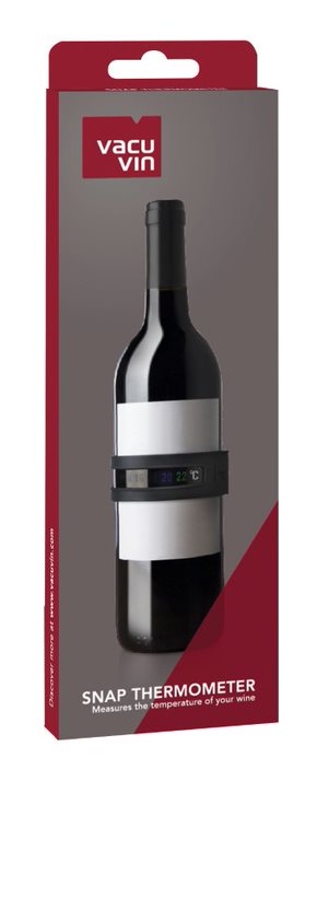 The Vacu Vin Snap Thermometer shows the temperature of your bottles of wine in to serve your wine at the right temperature. You can fold the thermometer easily around any bottle of wine. Like a snap bracelet you simply “snap” it around the bottle and the right temperature appears. The display on the thermometer will show the current temperature of the bottle in Celsius and Fahrenheit (depending on the purchased version). At the back of the thermometer you will find the advised serving temperature for various wines. This will ensure your wine is served at the right temperature. The Vacu Vin Snap thermometer’s compact and lightweight design, make it easy to carry, comfortable to use and store. The perfect gadget for wine enthusiasts!